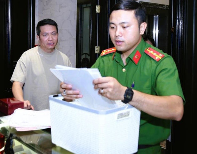 Ngay sau khi tống đạt các quyết định khởi tố bị can và lệnh bắt tạm giam, khám xét đối với 3 bị can, Công an tỉnh Đồng Nai đã khám xét nơi ở của ông Nguyễn Quốc Vũ, chồng ca sĩ Đoàn Di Băng, để điều tra tội Sản xuất, buôn bán hàng giả, xảy ra tại Công ty Cổ phần Nhà máy y tế EBC Đồng Nai (Ảnh: Công an Đồng Nai).