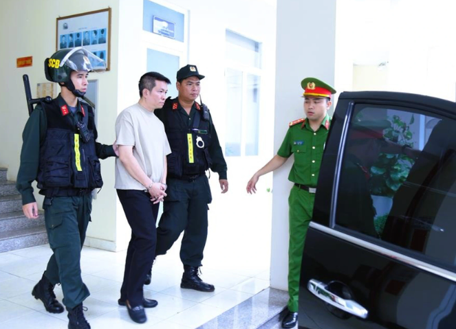 Ông Nguyễn Quốc Vũ (SN 1978, ngụ phường Tân Thuận, TPHCM) bị Công an tỉnh Đồng Nai áp giải từ trụ sở Công an tỉnh Đồng Nai về nhà riêng ở TPHCM để khám xét (Ảnh: Công an Đồng Nai).