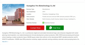 Theo Qichacha – đơn vị cung cấp thông tin doanh nghiệp tại Trung Quốc – Guangzhou YRM Biotechnology Co., Ltd thành lập từ năm 2015, hoạt động trong các lĩnh vực như nghiên cứu và phát triển công thức mỹ phẩm, sản xuất mỹ phẩm theo hình thức OEM (gia công theo thiết kế và yêu cầu của khách hàng) hoặc ODM (phát triển sản phẩm theo ý tưởng công ty rồi bán cho khách hàng mang thương hiệu riêng).