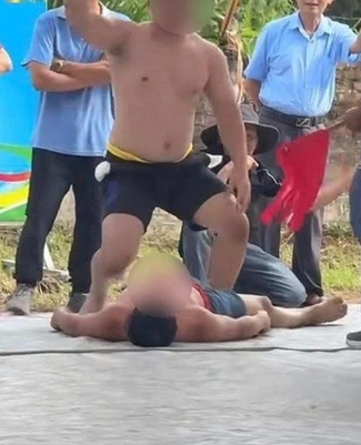 Trong các clip được đăng tải trên mạng xã hội, đô vật N.V.T (44 tuổi) bị gãy cổ trong một tình huống bị đối thủ quật đầu xuống sàn đấu và nằm im bất động.