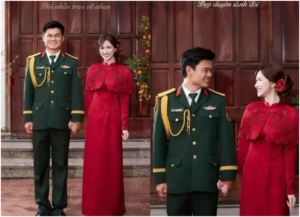 Trước đó, tối 6/3, hình ảnh Hòa Minzy diện áo dài đỏ, nắm tay một chàng trai mặc quân phục nhanh chóng thu hút sự chú ý của cộng đồng mạng. Trong bức ảnh, nữ ca sĩ mặc áo dài truyền thống, sánh bước bên người đàn ông trong quân phục, cả hai nắm tay và trao nhau ánh nhìn tình tứ.