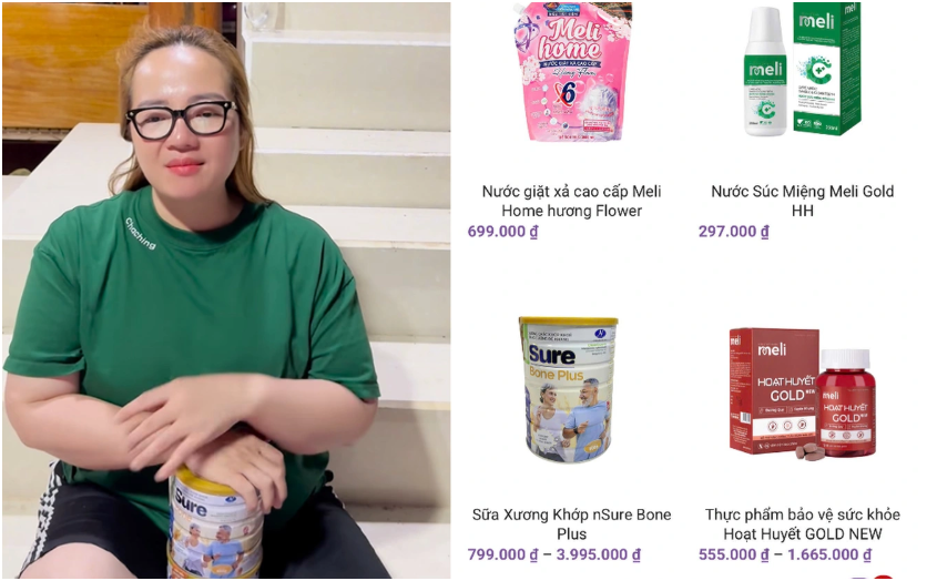 Hay các sản phẩm bảo vệ sức khỏe như hoạt huyết Gold New giá 555.000 đồng/hộp, nếu mua combo 3 hộp sẽ được tặng thêm 1 hộp giá 1,66 triệu đồng; nước súc miệng Meli Gold HH giá 297.000 đồng/hộp 3 chai; sữa xương khớp Sure Bone Plus giá 799.000 đồng/hộp; nội tiết tố nữ giá 699.000 đồng/hộp…