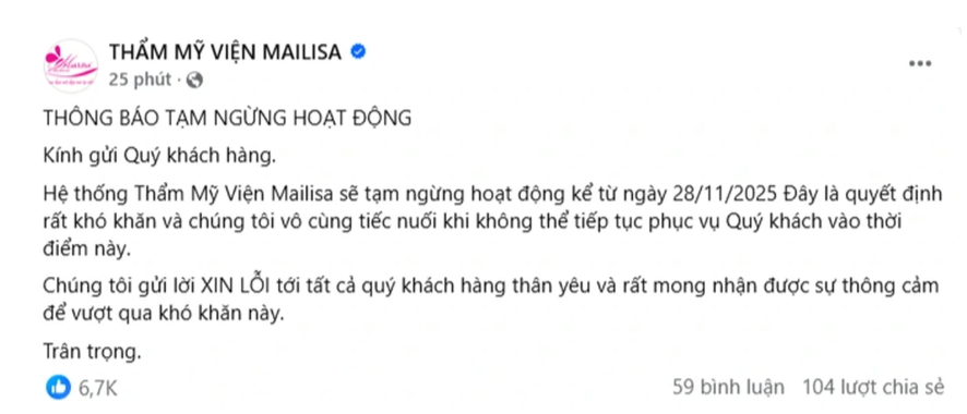Tối ngày 27/11, trên trang mạng xã hội Facebook có 2,8 triệu người theo dõi, thẩm mỹ viện Mailisa chính thức thông báo tạm ngừng hoạt động kể từ ngày 28/11.