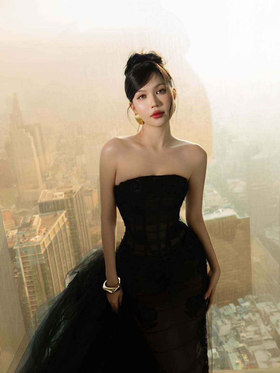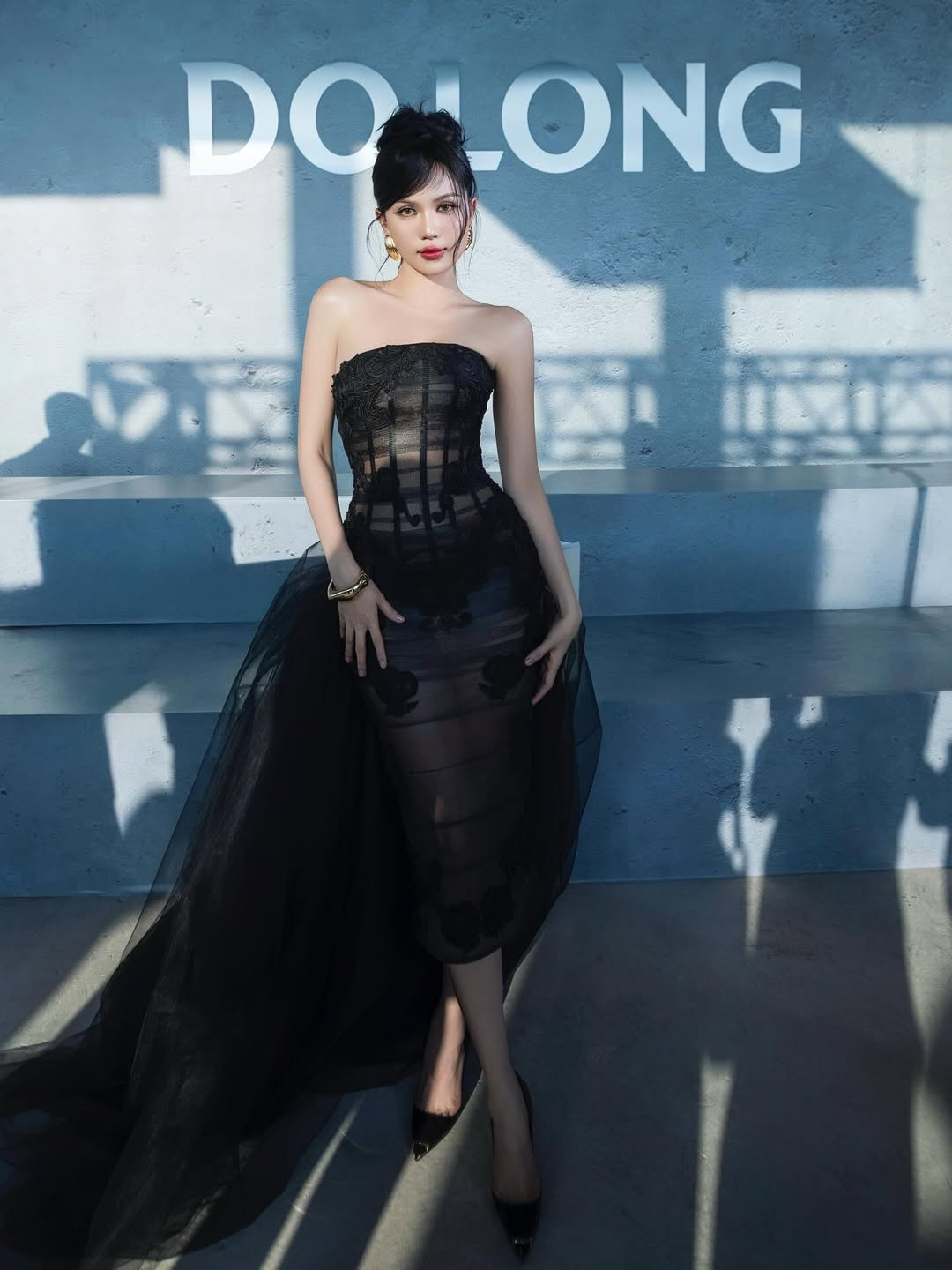 Xuất hiện trên thảm đỏ, Ngọc Trinh diện đầm đen xuyên thấu phom cúp ngực khai thác triệt để lợi thế vóc dáng. Điểm nhấn của chiếc đầm chính là phần tà váy cồng kềnh, dài quét đất giúp chủ nhân trông vừa gợi cảm, vừa quyền lực.