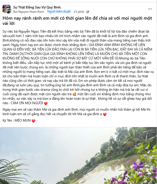 Theo nội dung lan truyền, người viết – ký tên “Mèo Mun” – cho biết sau hơn một năm im lặng, phía gia đình và bạn bè thân thiết của cố diễn viên quyết định lên tiếng.