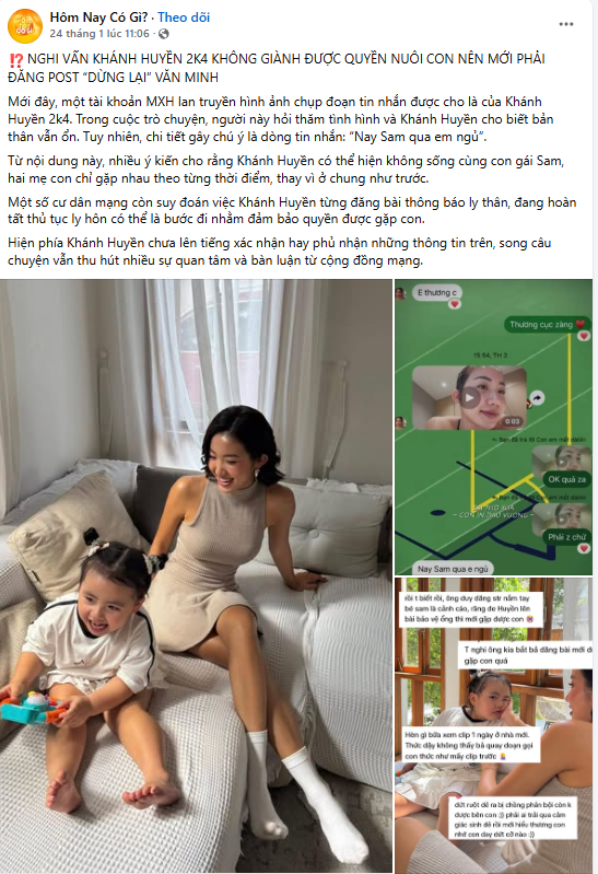 Một số cư dân mạng còn suy đoán việc Khánh Huyền từng đăng bài thông báo ly thân, đang hoàn tất thủ tục ly hôn có thể là bước đi nhằm đảm bảo quyền được gặp con.
