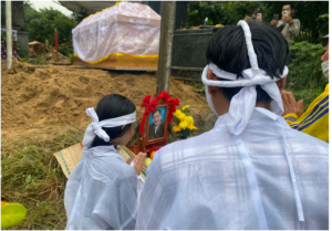 Trong tang lễ, con trai lớn của nghệ sĩ Thương Tín – ca sĩ Thanh Tùng – đội khăn tang, ôm di ảnh cha. Con gái nhỏ 12 tuổi của cố nghệ sĩ cũng có mặt, mặc đồ tang đứng cạnh anh trai.