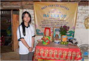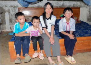 Dù mới bước qua tuổi 16, Hà Thị Mỹ Hương gánh vác trọng trách lớn khi vừa làm cha, làm mẹ, làm chị 3 em nhỏ. Hàng ngày, để có tiền trang trải cuộc sống, Hương xin làm thuê tại vườn rau của một hộ dân trong xã với tiền công 150.000 đồng/ngày. Số tiền này, Hương dành dụm mua gạo, mắm muối, lo bữa cơm cho các em.